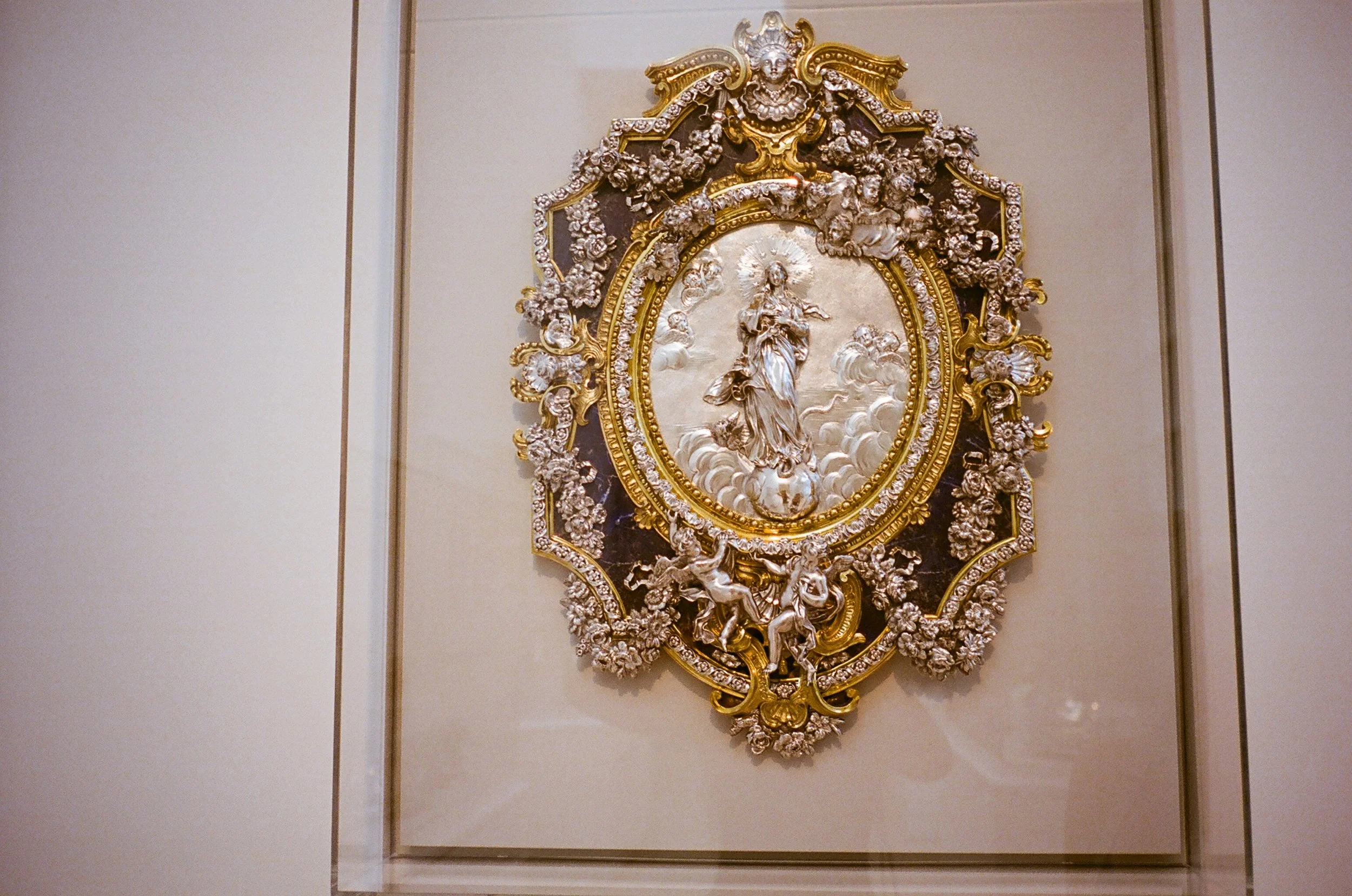 surrounded by the deep blue, lapis lazuli background of the gold frame, the silver virgin mary, crowned as queen of heaven, projects from the background in an elegant swirl of drapery. she stands on a globe, symbol of her dominion with christ.